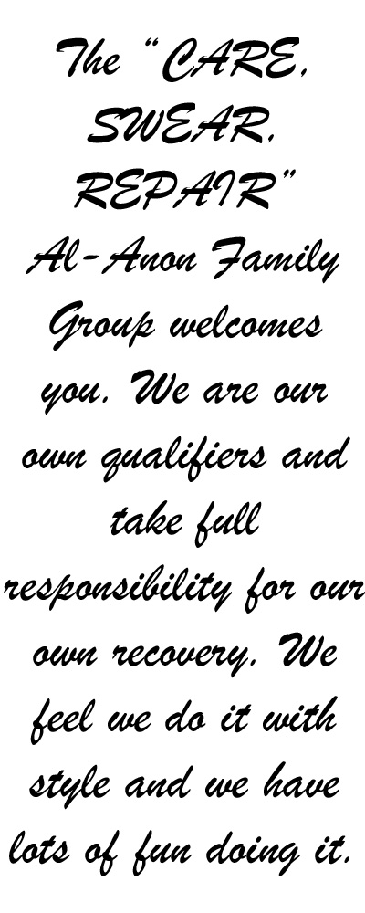 The CARE, SWEAR, REPAIR Al-Anon Family Group is an all inclusive, recovery based, 12th step group. We invite all that wish to join us on our journey of self-focused healing. We believe we are the the qualifiers that we need to change and that through determined work and self care, we can build a better tomorrow. We hope all that have shed many tears like us, will come to know the change we have found.